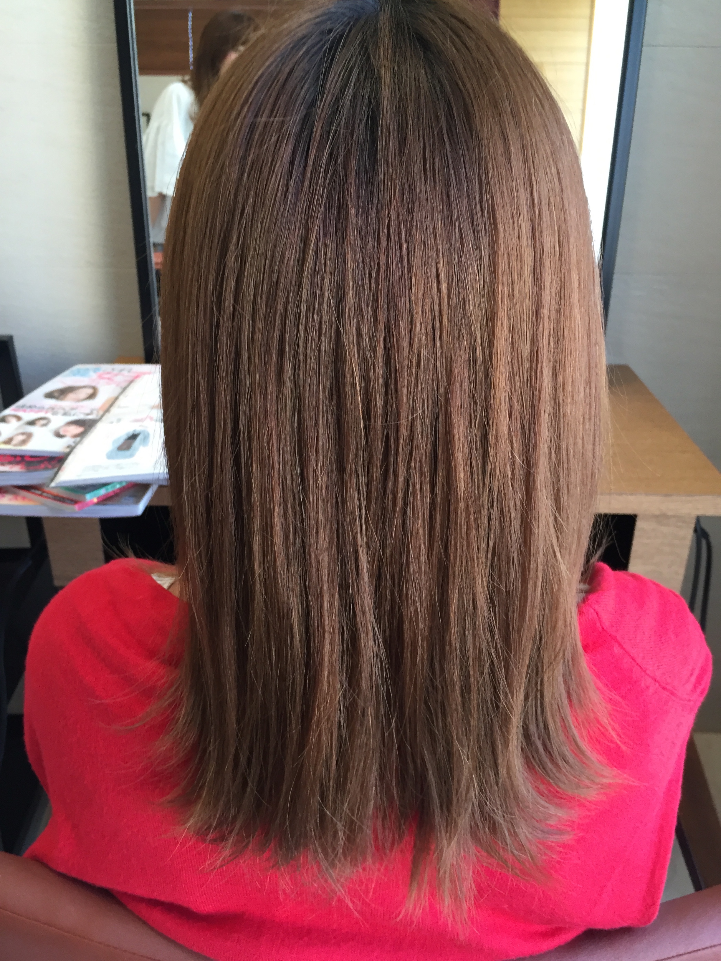 夏が過ぎ去っておらず、まだ暑いので、明るさはキープ!ただ、明るいだけではダメージして見えやすいのでツヤ感が出るように高明度のブラウンで色素を補正します。