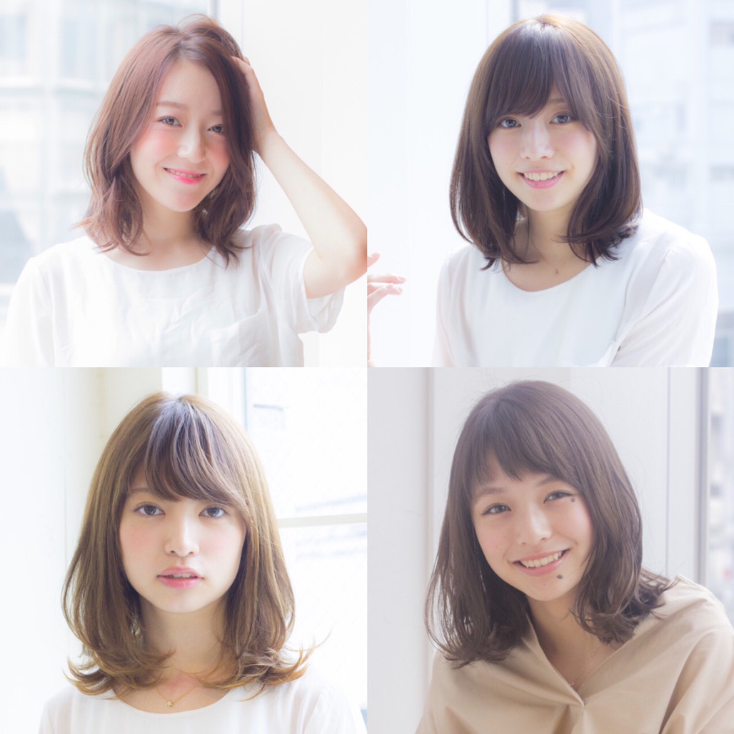 重めのミディアムベースのスタイルです。表面にレイヤー(段)を入れて少し軽さを出します。全体的な形は重めですが、パーマをかけることで、くびれたシルエットになります!