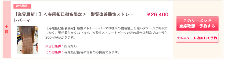 寺尾拓巳限定「酸性ストレートパーマ」 24000円(税抜き)