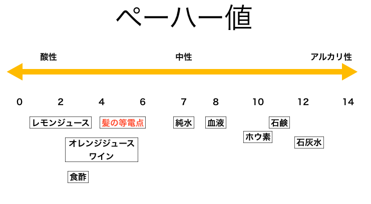 健康な毛髪の場合は、pH4.5~5.5くらいの弱酸性を示しこの領域が最も安定な状態になり、毛髪の等電点と言います。