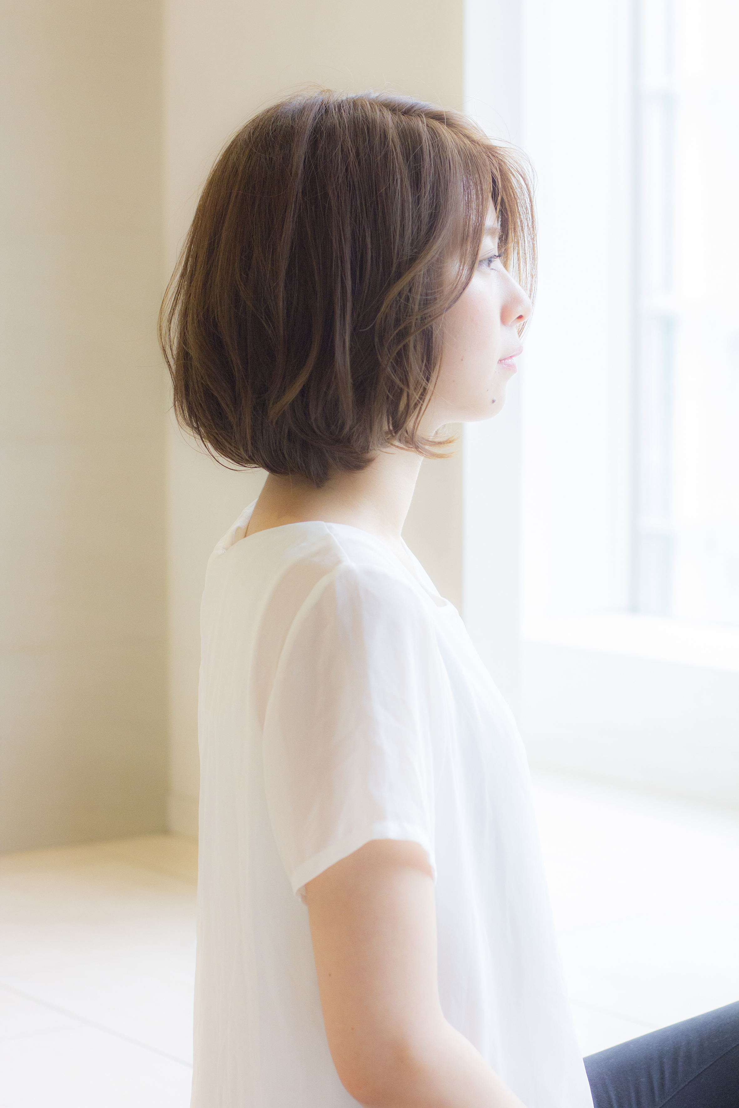 柔らかさと透明感が出るようにホワイトブラウンでカラーリング。ツヤ感もあるので明るくてもギラつきません。もちろんダークトーンでも似合うボブです。