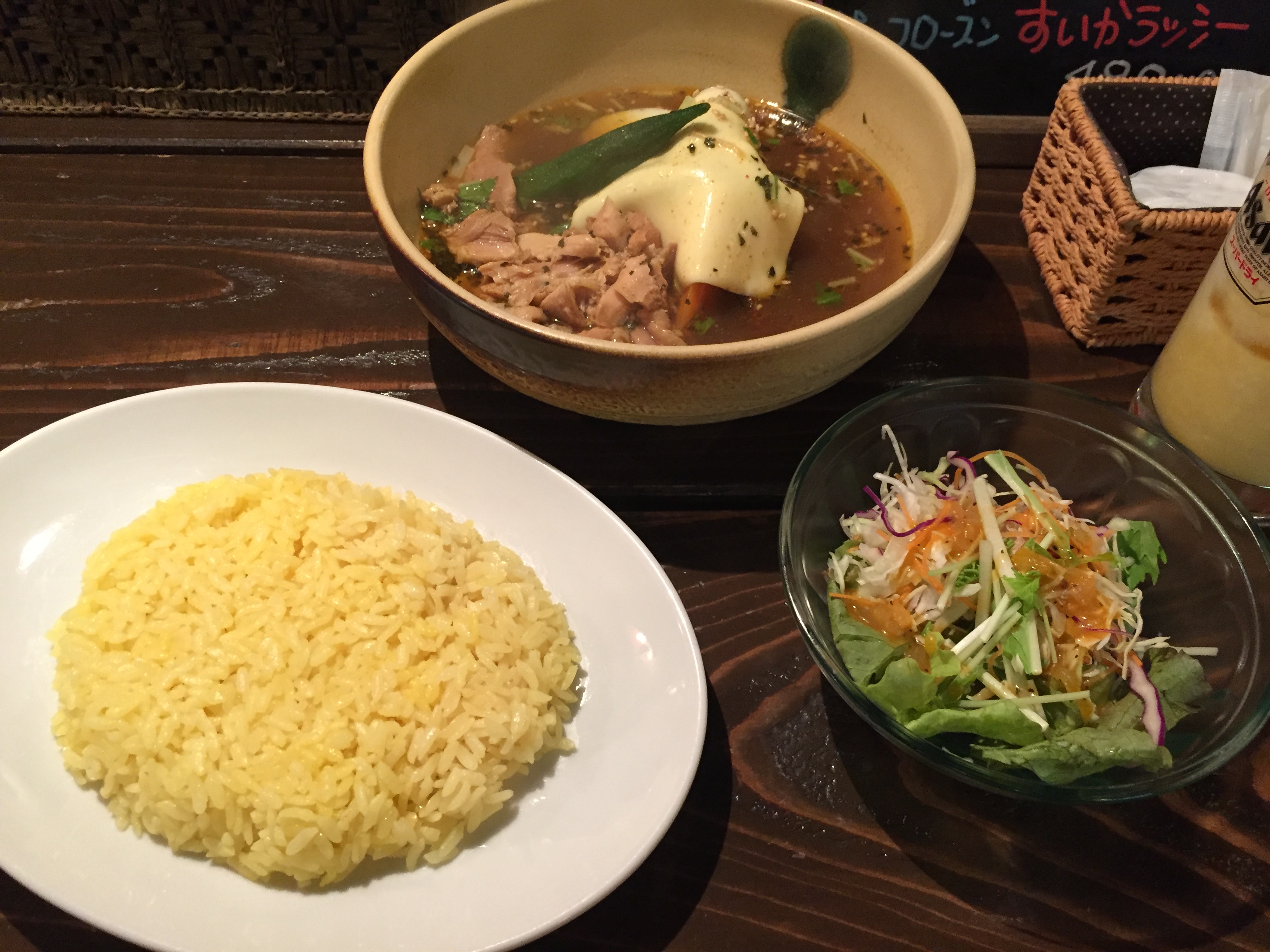 参考までに、僕は骨なしチキン、黄色スープ、辛さ1番、ご飯普通、オクラ・チーズのトッピングにしました♪辛さはお客様から、もっと数字をあげても大丈夫!!!と、言われていたんですが、初めて食べるスープカレーにビビり、1番を選択( ̄▽ ̄)笑