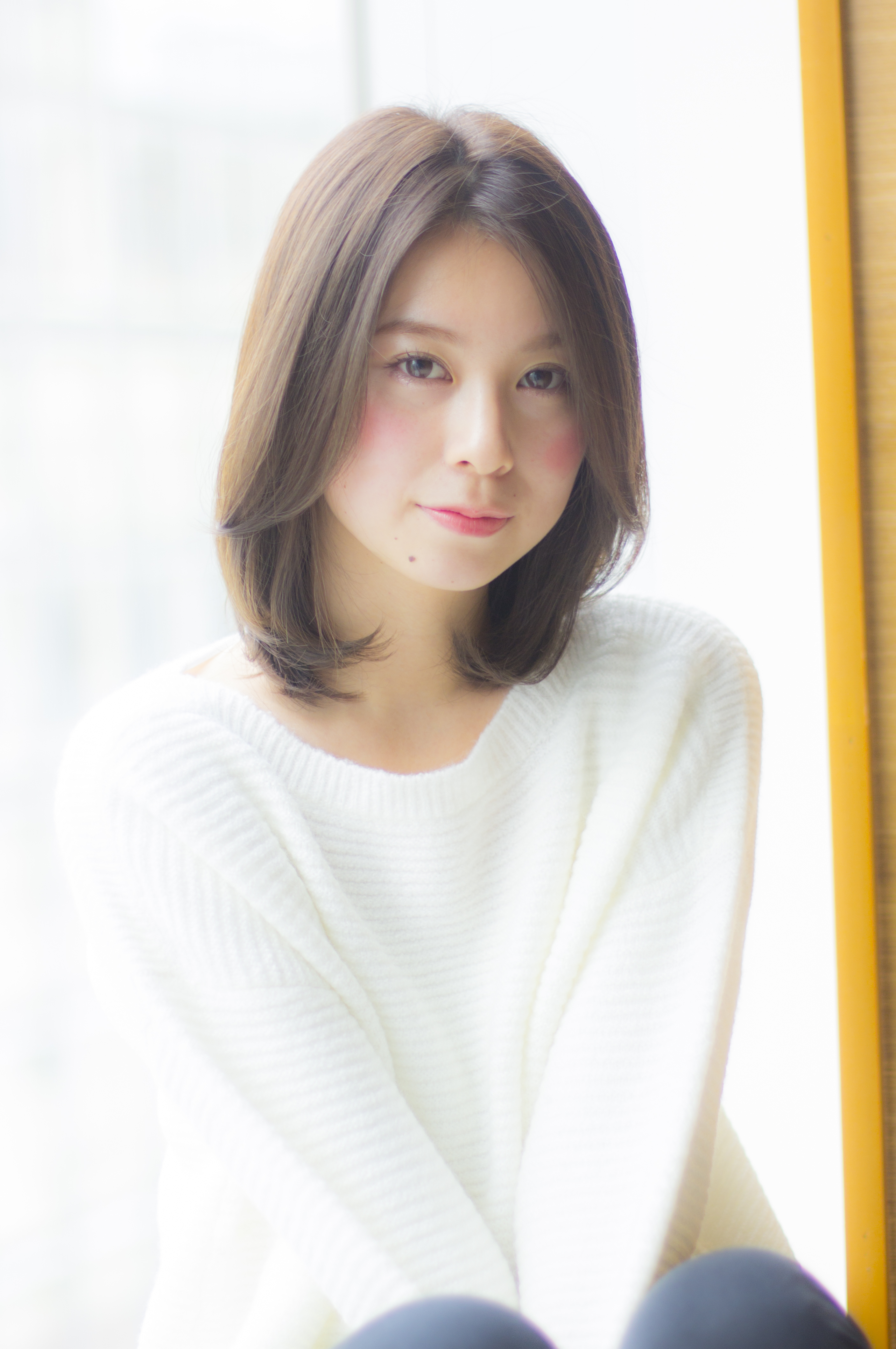 重めのボブディベースのカットです。毛先には柔らかい質感が出るようにそぎを入れて抜け感を出します。表面にレイヤー(段)を入れて、バランスをとりつつひし形にします。重めの形に飽きた方や、ボブからミディアムに伸ばしている途中の方には特にオススメです♪