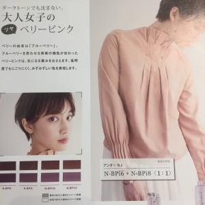 ベリーの由来は「ブルーベリー」で、ブルーベリーを思わせる青紫の補色が加わったベリーピンクは、普段、ピンク系統のカラーにすると、気になるギラツキを抑えてくれます。
