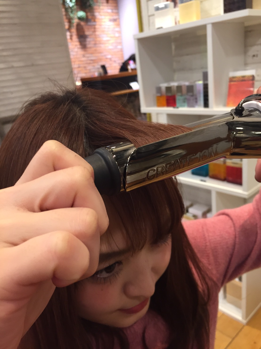 コテで、曲げようとすると、変に形がついてしまったりしやすいので、コテで温めて形を作るのは「手で」行います。