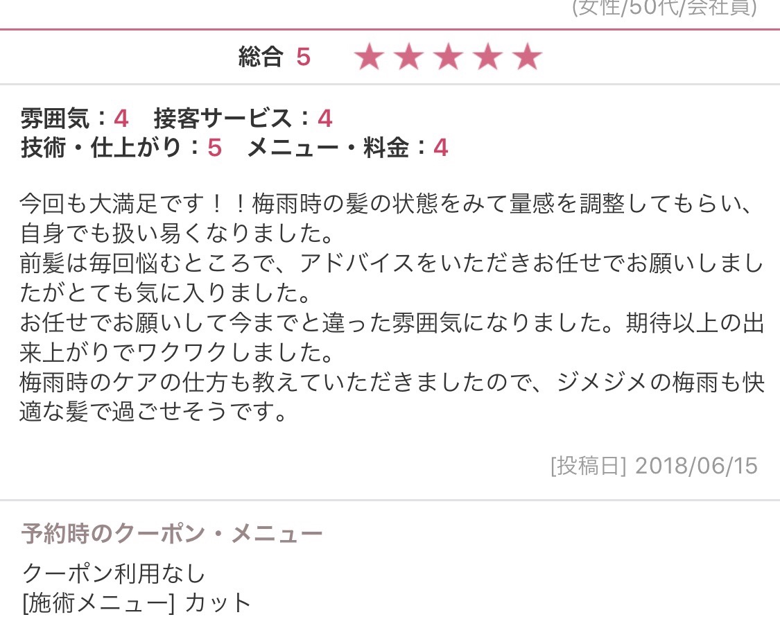 今回も大満足です!!梅雨時の髪の状態をみて量感を調整してもらい、自身でも扱い易くなりました。