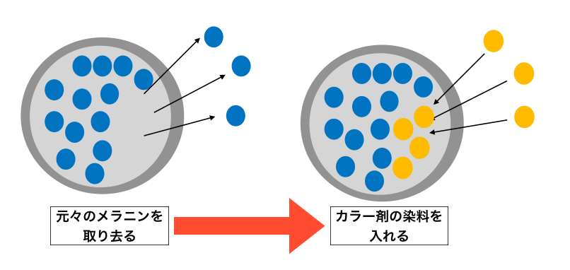 また、コルテックス内に届いた薬剤は髪が元々持つ、メラニンを破壊し、その空いたスペースに染料を入れる働きがあります。
