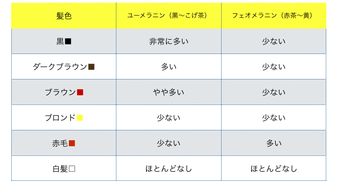 髪に含まれるユーメラニンの量が多いと黒色で、少ないとこげ茶色というように、髪に含まれる量によっても色が変わるのが特徴です。