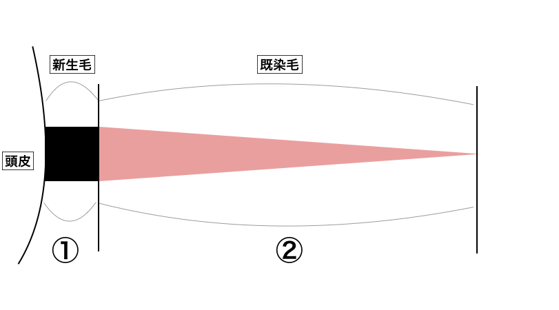 この1の部分を寺尾式オーダーメイドグレイカラー、2の部分はダメージレスイルミナカラーでカラーリングします。