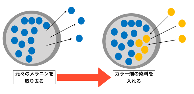 また、コルテックス内に届いた薬剤は髪が元々持つ、メラニンを破壊し、その空いたスペースに染料を入れる働きがあります。