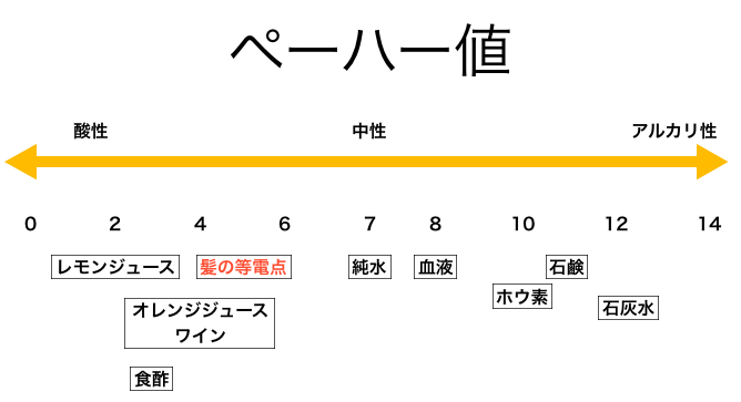 パーマ剤やカラー剤はアルカリ性のため、施術後に酸リンスなどで、等電点に範囲に戻す必要があります。