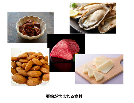 ちなみに、亜鉛が含まれる食べ物は牡蠣、レバー、魚介類、肉、チーズ、アーモンドなどが挙げられます。