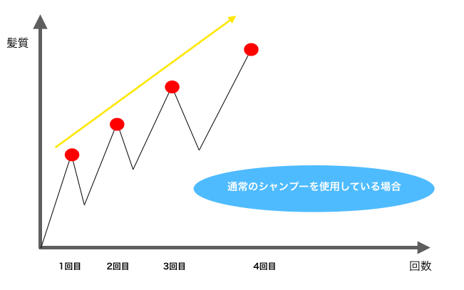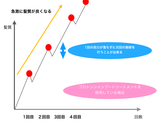 そのため、図のように効力をなるべく持続させた状態で、2回目、3回目と施術を行うことが出来ると髪質を改善していくスピードがより早くなります!