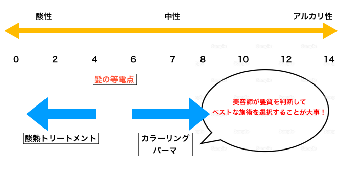 パーマ剤やカラー剤はアルカリ性のため、施術後に毛髪はアルカリに傾いてしまうことがほとんどです。