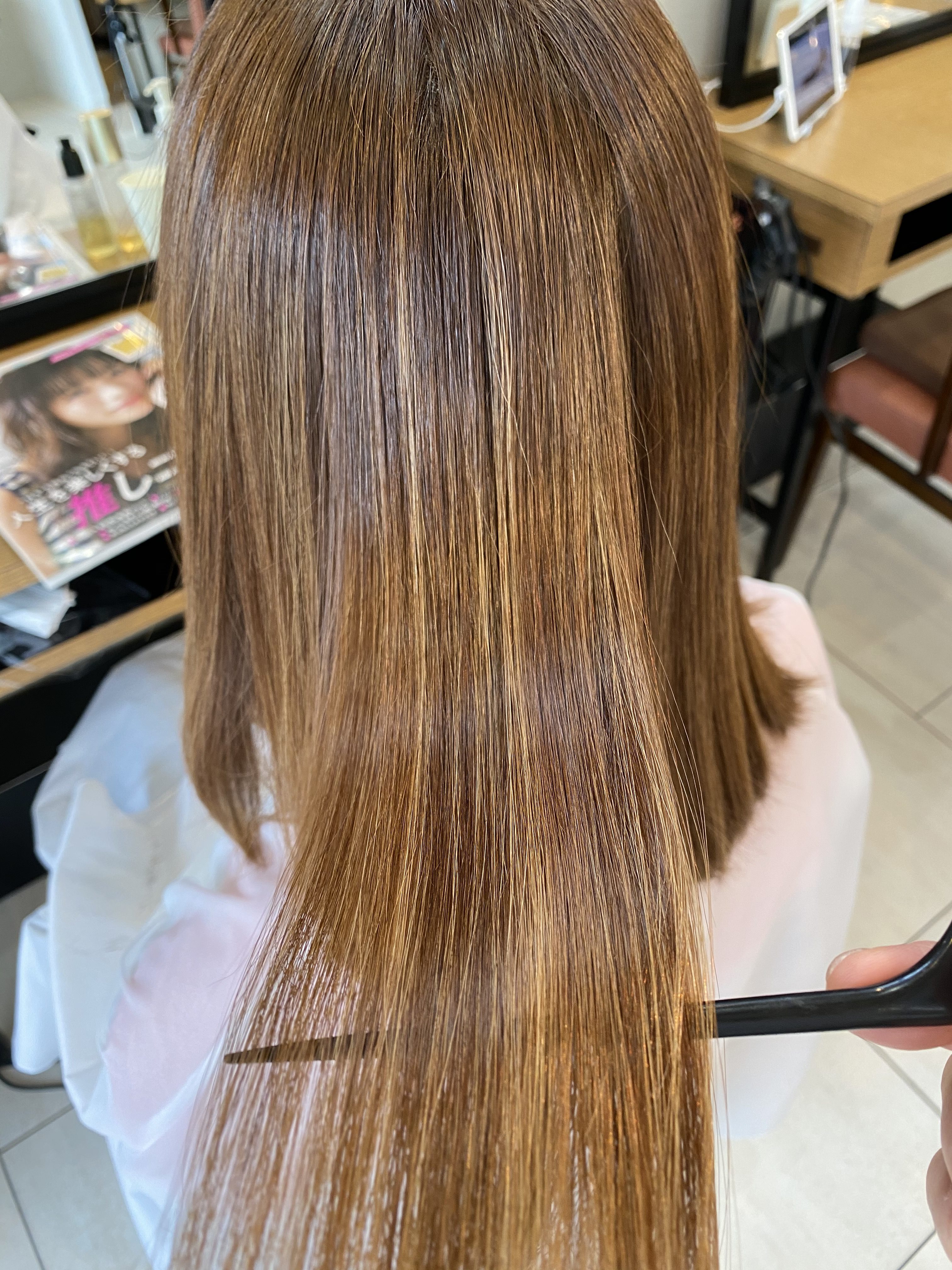 そうすることで、髪に対してすごく優しい弱酸性の薬剤で癖をしっかりと伸ばしながら、髪を柔らかくストレートにすることができるようになりました!