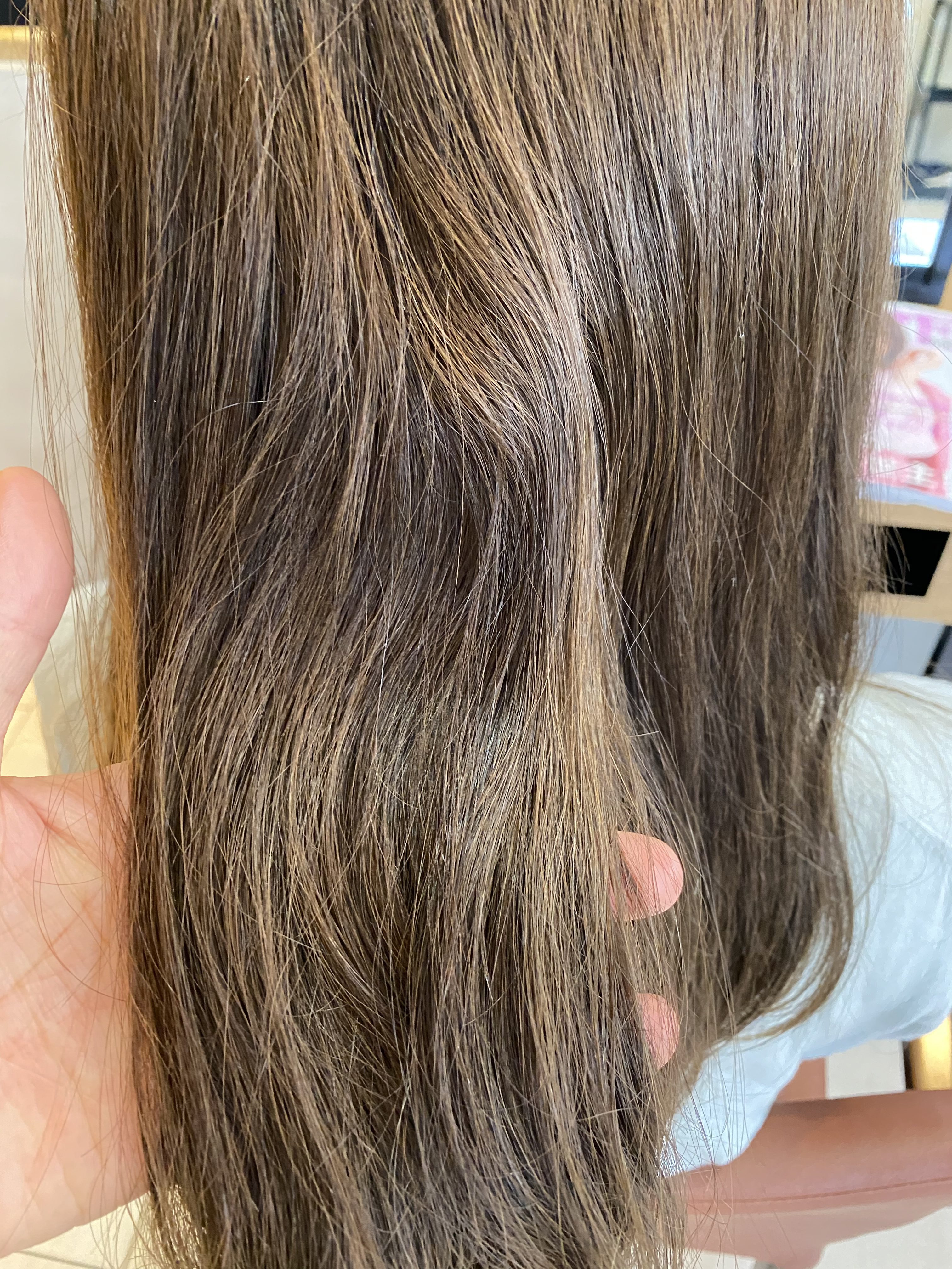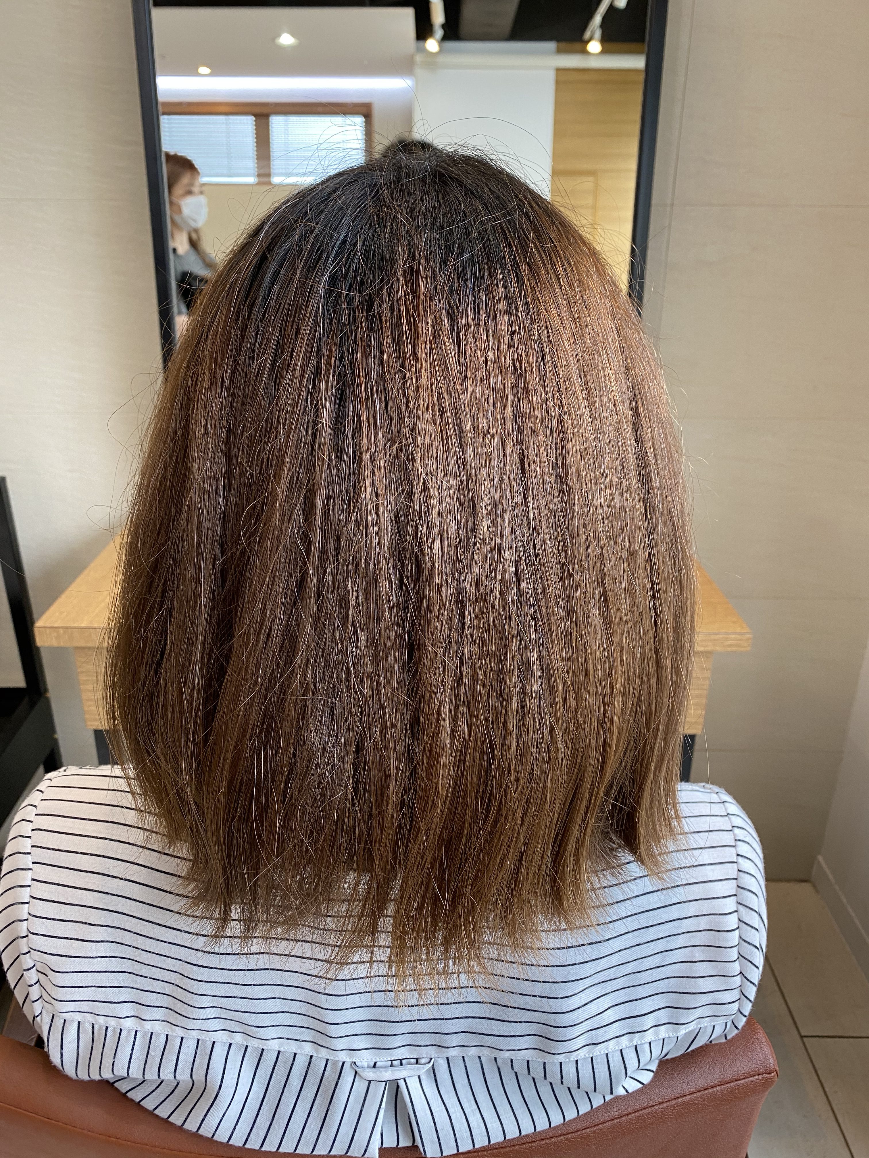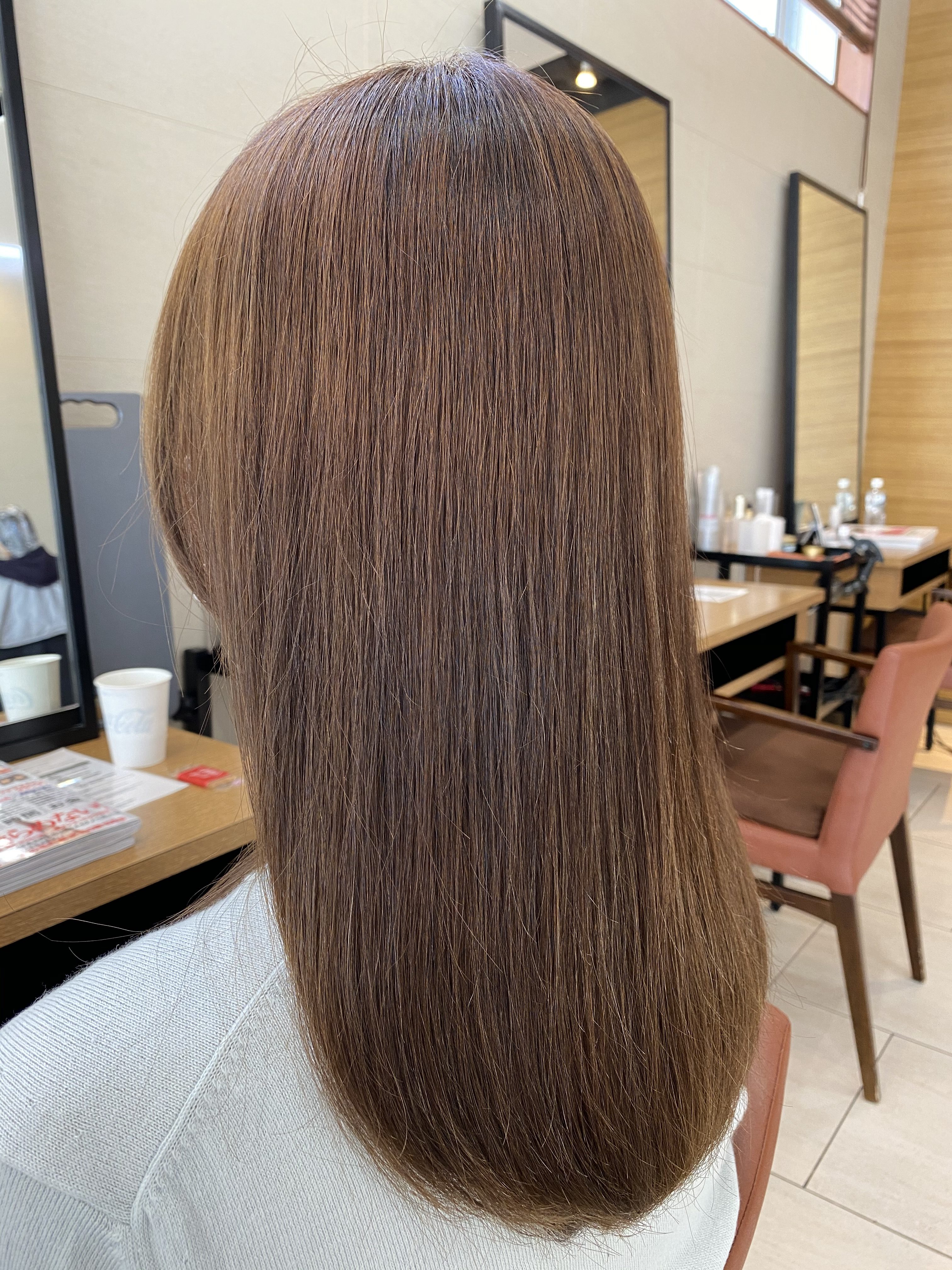 そのため、元々白髪染めをされている方よりもダメージはないですが、根元からしっかりと癖が伸びてしなやかなストレートになっています。