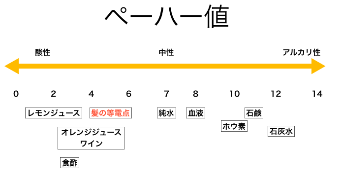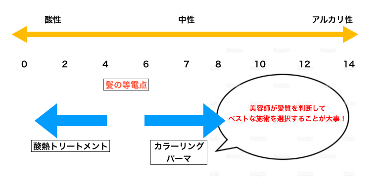 パーマ剤やカラー剤はアルカリ性のため、施術後に毛髪はアルカリに傾いていることがほとんどです。