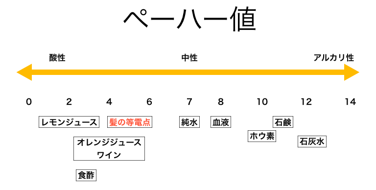 健康な毛髪の場合は、pH4.5~5.5くらいの弱酸性を示しこの領域が最も安定な状態になり、毛髪の等電点と言います。