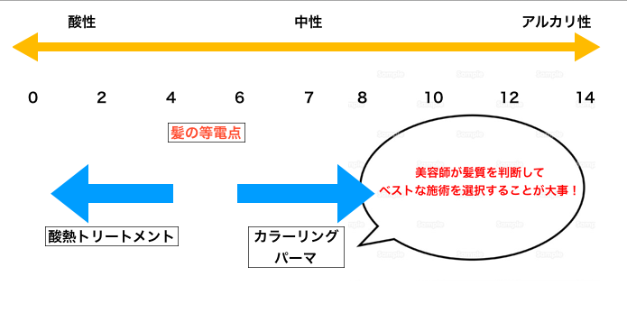 パーマ剤やカラー剤はアルカリ性のため、施術後に毛髪はアルカリに傾いてしまうことがほとんどです。