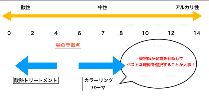 パーマ剤やカラー剤はアルカリ性のため、施術後に毛髪はアルカリに傾いてしまうことがほとんどです。