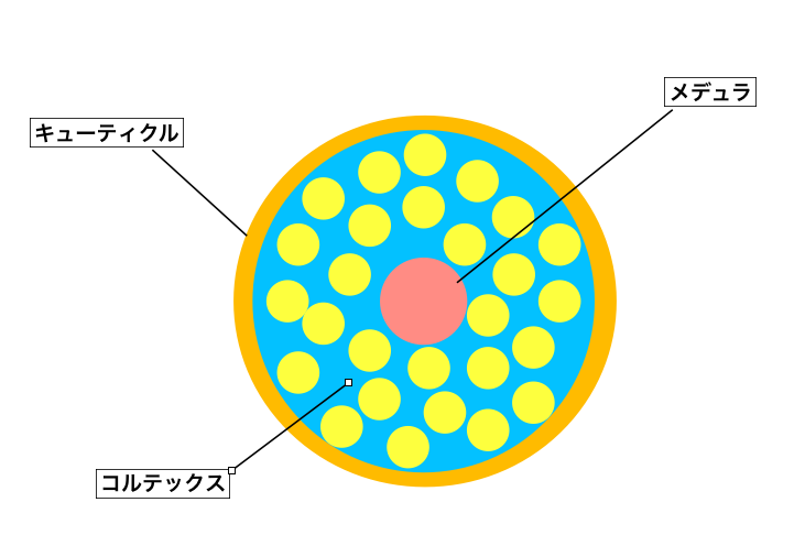 コルテックス…メラニンを含む柔らかいタンパク質で構成されています。髪の性質を決める大事な部分です。